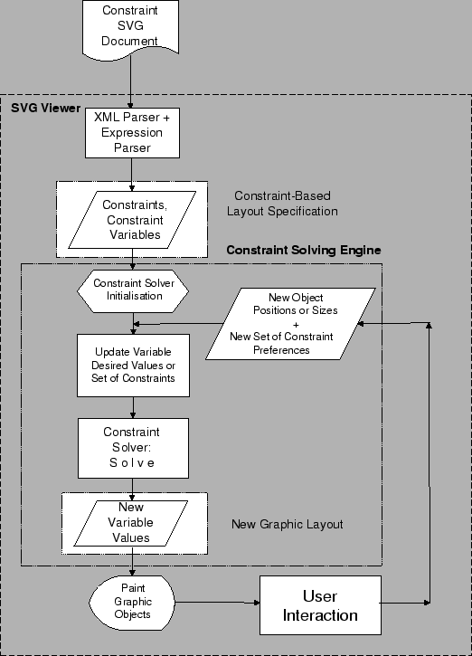 After the XML parser reads in the SVG document, we create all the variable and constraint objects of the document, then we feed them to a constraint solving engine. When the solution is available, the viewer renders the graphic objects. Every time a user initiates a resize or movement of an object, the new size or coordinate position of the object is used for setting the associated constraint variables' desired values. The constraint engine then is called to find another solution that reflects the new presentation of all graphic objects in the layout. The same process happens when the validity of group pre-conditions changes due to interactive manipulation. When switching to a different gcase element, the constraints and variables of the previous gcase element are removed from the engine, and the new set of constraints and variables is added before we re-solve the system.